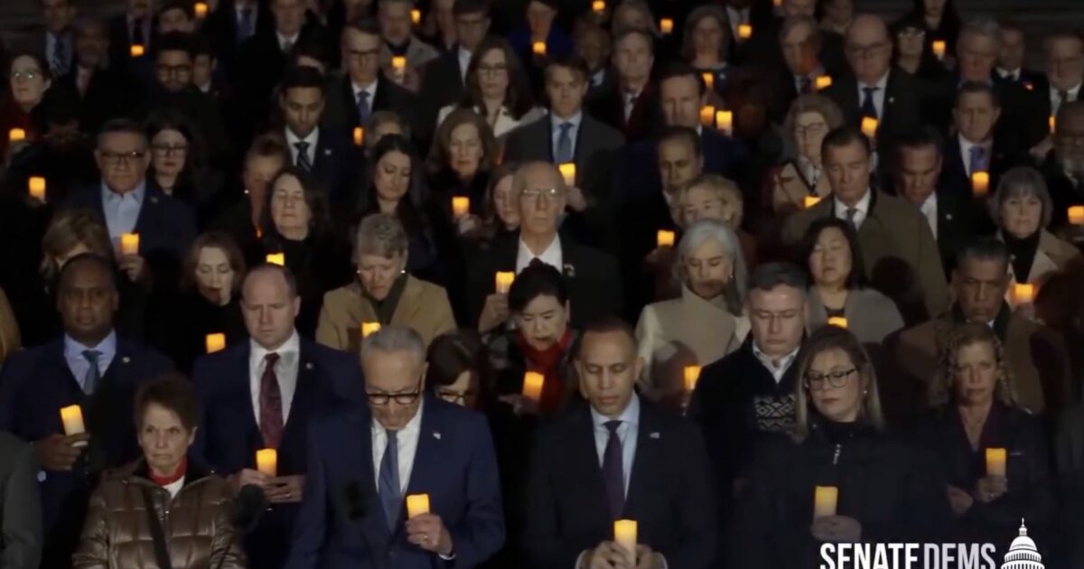 Led by House Minority Leader Hakeem Jeffries and Senate Minority Leader Chuck Schumer, the group of Democrats stood in the freezing D.C. air, clutching flickering candles, and singing “God Bless America.”